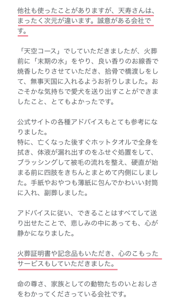 ペットのおみおくり天寿は、ただの訪問[火葬]業者ではなく、天国へお送りする[送り人]として活動しております。一緒に過ごしたご家族の葬儀を心から寄り添って行い、ご要望にできる限り、お応えできるように努めさせて頂きます。